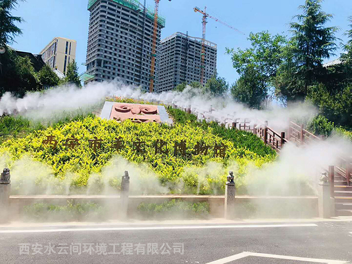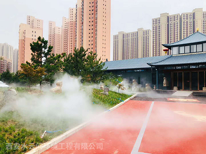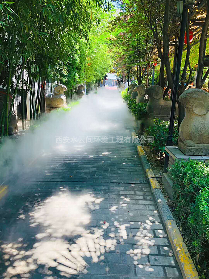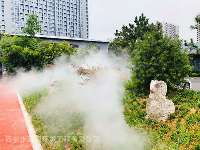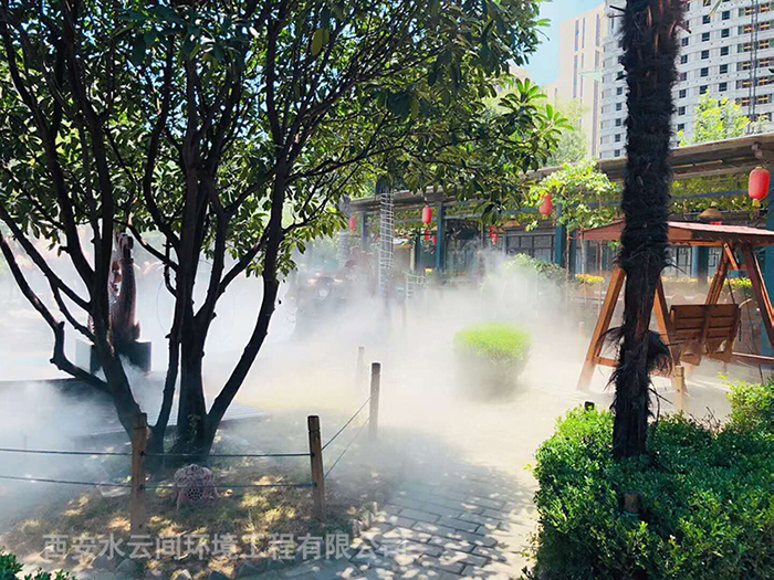 石羊農(nóng)莊位于西安雁翔路南頭漢宣帝陵西側(cè)300米,集餐飲旅游休閑娛樂(lè)于一體。西安水云間環(huán)境工程有限公司為山莊設(shè)計(jì)安裝噴霧造景系統(tǒng)。水云間噴霧造景系統(tǒng),是以自來(lái)水為水源經(jīng)過(guò)二級(jí)過(guò)濾后,經(jīng)霧化主機(jī)加壓,霧化噴頭霧化成細(xì)小的水霧顆粒。產(chǎn)生的水霧量大,輕盈飄渺,很適合用于景觀相襯造景。人工制造的霧效兼具造景、降溫、降塵的效果。
