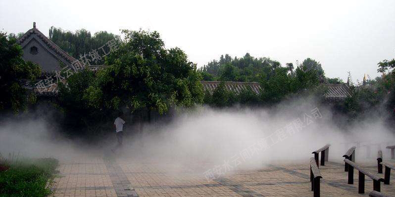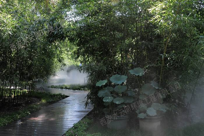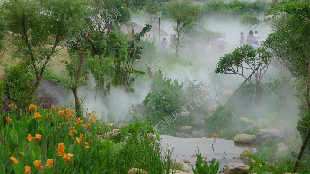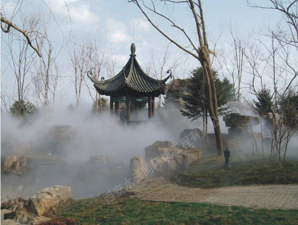 1.造景和保濕:霧既可輕盈婉約,虛無飄渺,又可溟溟漠漠,浩浩漫漫,即可單獨(dú)成景,自成一方天地,又可結(jié)合水系、假山、綠植、燈光等各種元素而形態(tài)各異,相得益彰。其變化多端的形態(tài)和功能,將為中國(guó)園林的景觀意境更添水墨元素。其特有的保濕功能,能更好的兼具植物的養(yǎng)護(hù)和生長(zhǎng);