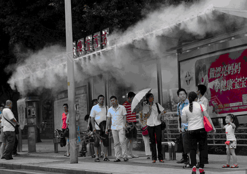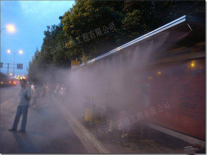 戶(hù)外空間環(huán)境降溫,可以局部地控制大環(huán)境的溫度。人造霧降溫系統(tǒng)散發(fā)到空氣中的水微粒,在汽化的過(guò)程中要吸收大量周?chē)h(huán)境中的熱量,蒸發(fā)冷卻從而降低周?chē)h(huán)境溫度的原理,是戶(hù)外防暑降溫的有效手段。