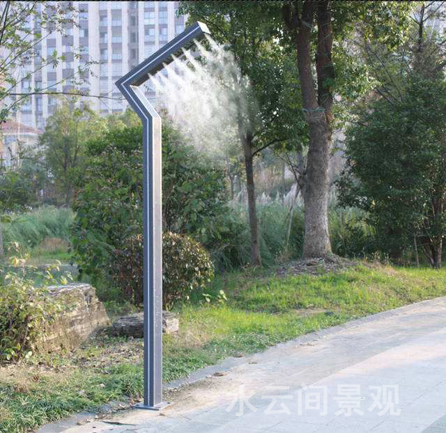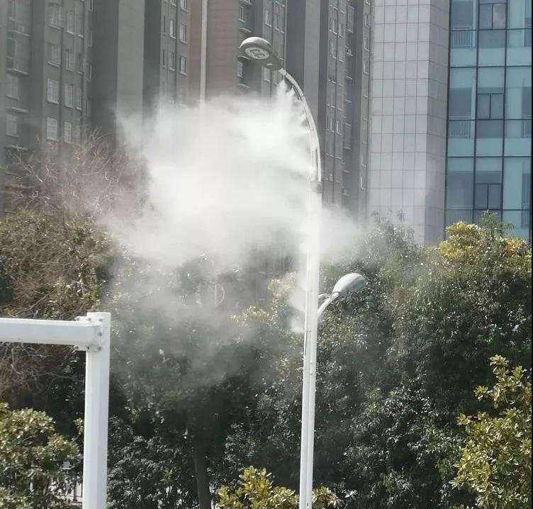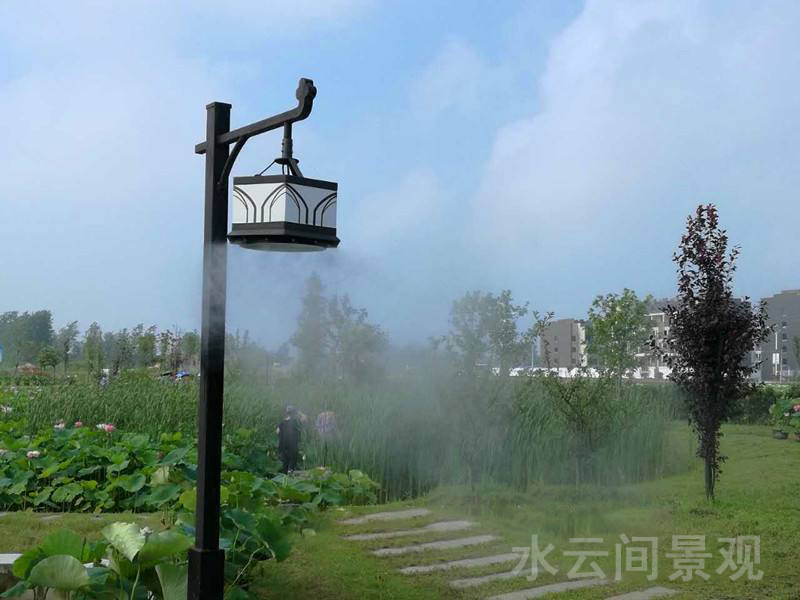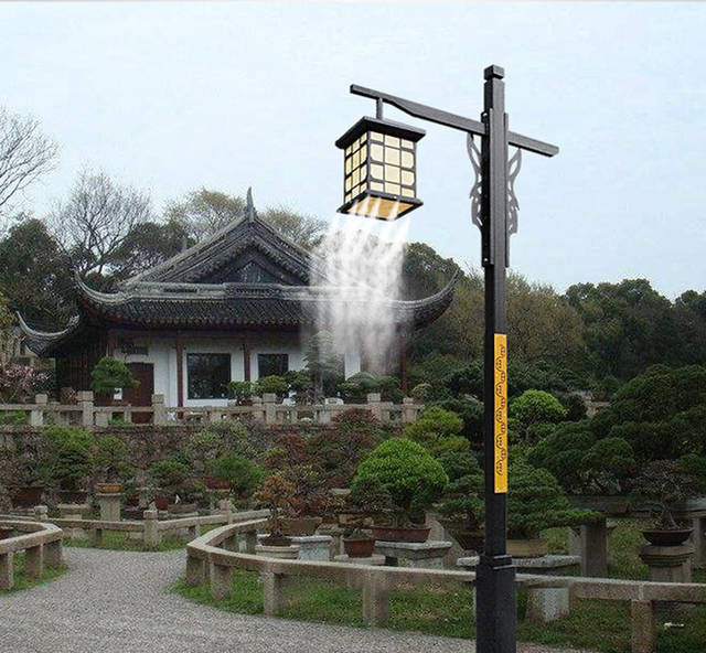 噴霧燈桿式利用人造霧設(shè)備對(duì)景觀燈,路燈進(jìn)行改造,在不影響原有照明正常使用的情況下,在燈桿上安裝噴霧噴頭。霧化的水霧可起到降溫、降塵的作用。