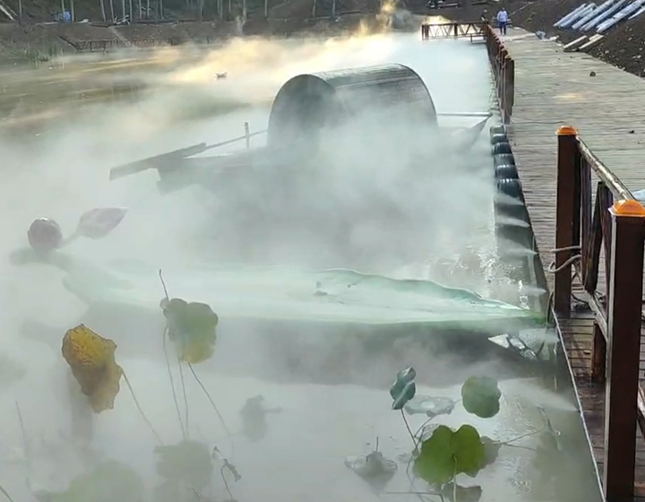 還可以根據(jù)環(huán)境需求進(jìn)行調(diào)節(jié),如控制霧滴的大小、密度和擴(kuò)散范圍,以達(dá)到最佳的造景效果。這種技術(shù)被廣泛應(yīng)用于景觀造霧、舞臺(tái)造景、空氣加濕、環(huán)境降溫等領(lǐng)域,為人們營造出一種回歸自然的感覺。水云間景觀安裝施工西安初見文化觀光生態(tài)園水池霧森項(xiàng)目。霧效均勻,覆蓋范圍廣。